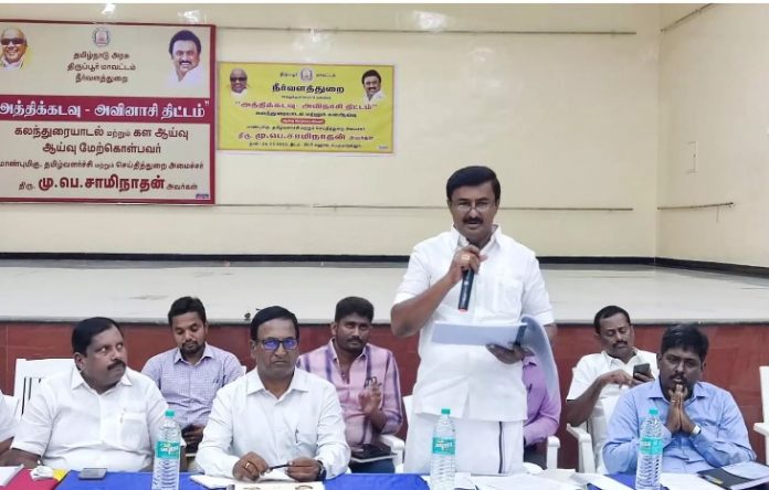 அத்திக்கடவு-அவினாசி திட்டம் அடுத்த மாதம் பயன்பாட்டிற்கு வருகிறது என்று அமைச்சர் மு.பெ. சாமிநாதன் கூறினார். பெருமாநல்லூரில் உள்ள ஒரு திருமண மண்டபத்தில் அத்திக்கடவு-அவினாசி திட்டத்தின் ஆய்வுக்கூட்டம் நடைபெற்றது. கூட்டத்திற்கு மாவட்ட ஆட்சியர் கிறிஸ்துராஜ் தலைமை தாங்கினார். இதில் தமிழ் வளர்ச்சி மற்றும் செய்தித்துறை அமைச்சர் மு.பெ.சாமிநாதன் கலந்து கொண்டு பேசியதாவது:-