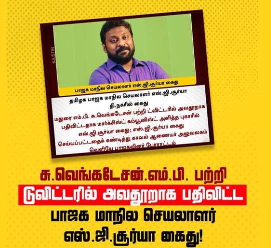 பாஜக மாநில செயலாளர் எஸ்.ஜி. சூர்யா என்பவர் மார்க்சிஸ்ட் கம்யூனிஸ்ட் கட்சியின் மாநில செயற்குழு உறுப்பினரும், மதுரை மக்களவை தொகுதி உறுப்பினருமான தோழர் சு. வெங்கடேசன் குறித்து ஆதாரமில்லாத, அப்பட்டமான அவதூறை சமூக ஊடகங்களில் பதிவிட்டுள்ளார். இது மார்க்சிஸ்ட் கம்யூனிஸ்ட் கட்சியையும், நாடாளுமன்ற உறுப்பினர் தோழர் சு. வெங்கடேசனையும் களங்கப்படுத்தும் இழிவான முயற்சியாகும். இதை மார்க்சிஸ்ட் கம்யூனிஸ்ட் கட்சியின் தமிழ்நாடு மாநில செயற்குழு வன்மையாக கண்டிக்கிறது.