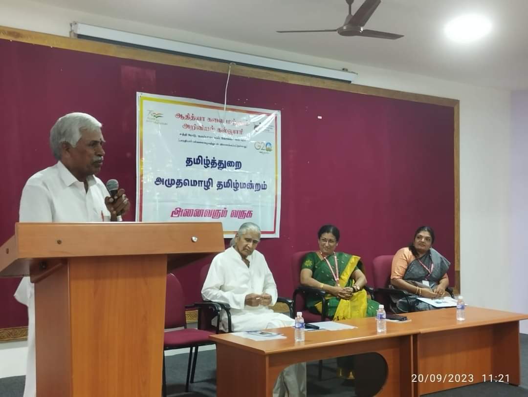 “தொல்காப்பியமும் திருக்குறளும் ஓர் ஆய்வு” – என்ற பொருளில் கருத்தரங்கம் கோவை சக்தி சாலையில் உள்ள ஆதித்யா கலை அறிவியல் கல்லூரியில் நடைபெற்றது. தமிழ்த்தாய் வாழ்த்து உடன் கருத்தரங்கம் தொடங்கியது. கல்லூரியின் தமிழ்த்துறை தலைவர் முனைவர் தேவி அனைவரையும் வரவேற்றுப் பேசினார்.
