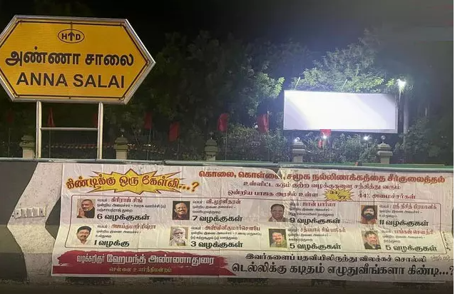 அந்த போஸ்டரில் “கிண்டிக்கு ஒரு கேள்வி…? கொலை, கொள்ளை, சமூக நல்லிணக்கத்தை சீர்குலைத்த உள்ளிட்ட கடும் குற்ற வழக்குகளை மத்திய பாஜக அரசில் உள்ள 34/77… 44% அமைச்சர்களை பதவியில் இருந்து விலகச் சொல்லி டெல்லிக்கு கடிதம் எழுதுவீங்களா கிண்டி…?’’ என குறிப்பிடப்பட்டுள்ளது. மேலும் போஸ்டரில் மத்திய மந்திரிகள் சிலரின் பெயர் மற்றும் புகைப்படங்கள் இடம்பெற்றுள்ளன.
