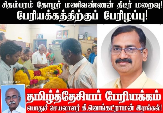 தமிழ்த்தேசியப் பேரியக்கம் (தொடக்கத்தில் எம்.சி.பி.ஐ.) உருவாக்கப்பட்ட காலத்தில், இளம் வயதில் இணைந்ததிலிருந்து சிதம்பரத்தில் தொடர்ந்து முன்னணிச் செயல்பாட்டாளராக விளங்கிய தோழர் ச. மணிவண்ணன் இன்று (21.06.2023) அதிகாலை அண்ணாமலைப் பல்கலைக்கழக இராசா முத்தையா மருத்துவமனையில் காலமானார். அவருக்கு அகவை 60.