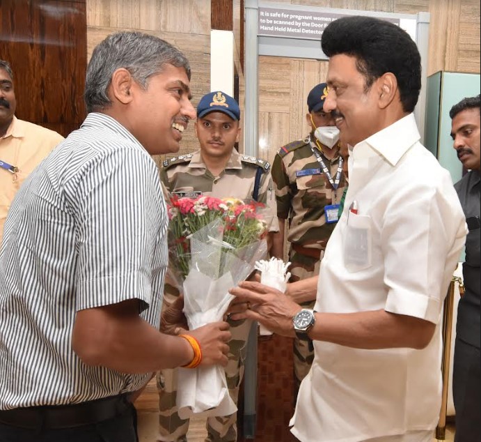 பெங்களூரு விமான நிலையத்தில் முதலமைச்சர் மு.க.ஸ்டாலினை கர்நாடக மின் ஆளுமைத் துறை செயலாளர் பொன்ராஜ் ஐ.ஏ.எஸ் பூங்கொத்து கொடுத்து வரவேற்றார். ஓசூர் எம்.எல்.ஏ பிரகாஷ், பர்கூர் எம்.எல்.ஏ மதியழகன், கர்நாடக திமுக அமைப்பாளர் ராமசாமி ஆகியோர் உடன் இருந்தனர்.