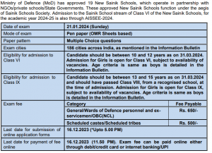 சைனிக் பள்ளி சேர்க்கை அறிவிப்பு வெளியாகி இருக்கிறது. அகில இந்திய சைனிக் பள்ளிகள் (AISSEE) நுழைவுத் தேர்வு 2024 ஆம் ஆண்டு, ஜனவரி 21 ஆம் தேதி நாடு முழுவதும் நடைபெறுகிறது. இத்தேர்வின் மூலம் 2024 – 2025 ஆம் ஆண்டுக்கான 6, 9 ஆம் வகுப்பு மாணவர் – மாணவியர் சேர்க்கை நடைபெறும்.