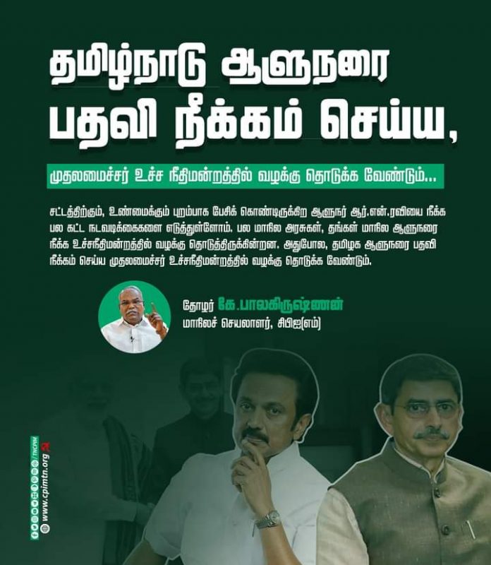 இதுகுறித்து, மார்க்சிஸ்ட் மாநில செயலாளர் கே.பாலகிருஷ்ணன் வெளியிட்ட அறிக்கையில், “தமிழ்நாடு ஆளுநரை பதவி நீக்கம் செய்ய, முதலமைச்சர் உச்ச நீதிமன்றத்தில் வழக்கு தொடுக்க வேண்டும்.