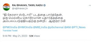 நுங்கப்பாக்கத்தில் உள்ள திரையரங்கிற்கு சென்ற கவர்னர் ஆர்.என்.ரவி அங்கு, ,தி கேரளா ஸ்டோரி’ திரைப்படத்தை பார்த்தார். இந்த படத்தை பார்த்த பின் கவர்னர் ஆர்.என்.ரவி தனது டுவிட்டர் பக்கத்தில் வெளியிட்டுள்ள பதிவில், ‘தி கேரளா ஸ்டோரி’ படத்தை பார்த்தேன். ஒரு மெல்லிய கொடூரமான யதார்த்தத்தை அம்பலப்படுத்தியதற்கு நன்றி’ என தெரிவித்துள்ளார்.