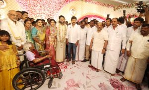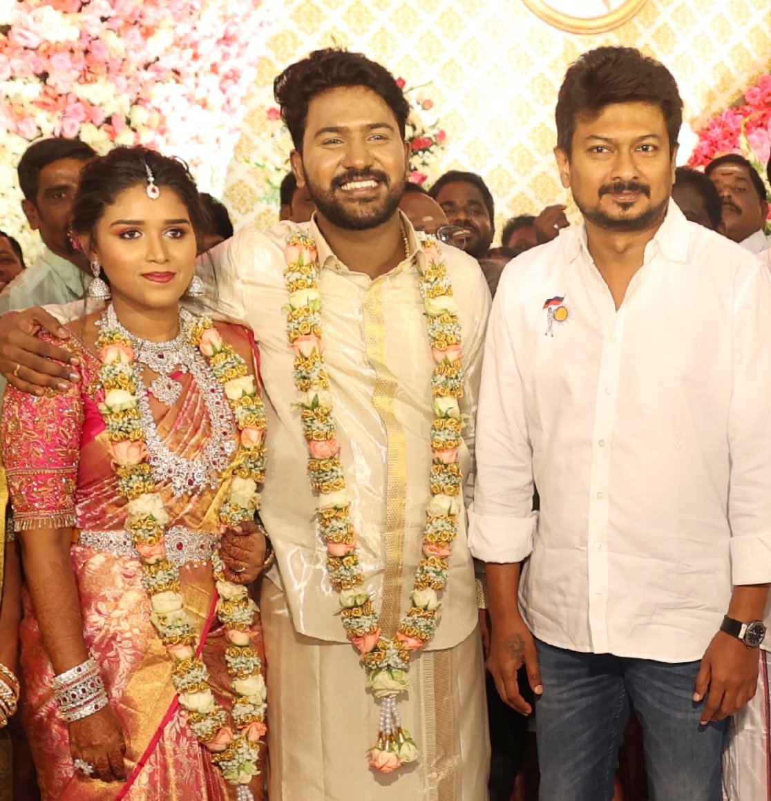 திமுக இளைஞரணி செயலாளரும் இளைஞர் நலன் மற்றும் விளையாட்டுத்துறை அமைச்சருமான உதயநிதி ஸ்டாலின் நேரில் வந்து மணமக்களை வாழ்த்தினார். அவர் தனது டுவிட்டர் பக்கத்தில் மணமக்களை வாழ்த்திய போட்டக்களை பதிவேற்றம் செய்துள்ளார். வாழ்த்து அறிக்கையும் வெளியிட்டுள்ளார்.