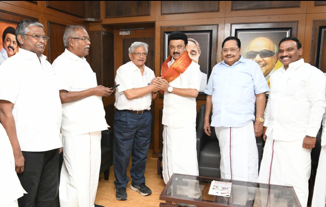 மார்க்சிஸ்ட் கம்யூனிஸ்ட் கட்சியின் பொதுச்செயலாளர் சீத்தாராம் யெச்சூரி சென்னையில் செவ்வாயன்று (மே 16) தமிழ்நாடு முதலமைச்சரும் திமுக தலைவருமான மு.க.ஸ்டாலினை அண்ணா அறிவாலயத்தில் சந்தித்துப் பேசினார்.