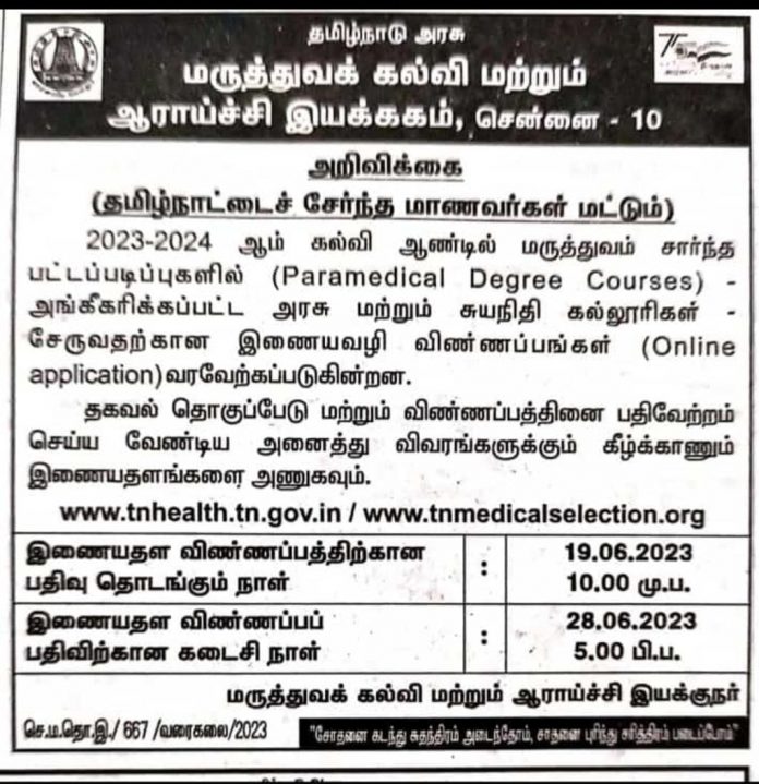 தமிழகத்தில் மருத்துவம் சார்ந்த 19 பட்டப்படிப்புகளுக்கான (பாராமெடிக்கல் கோர்ஸ்) மாணவர் சேர்க்கைக்கு ஜுன் 19- ம் தேதி முதல் ஆன்லைனில் விண்ணப்பிக்கலாம் என்று தமிழ்நாடு மருத்துவ கல்வி இயக்கம் அறிவித்துள்ளது.