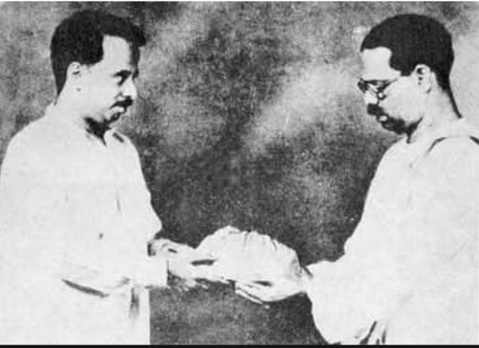 தமிழ்மொழி மீது பற்றுக் கொண்டவராக இருந்த பாரதிதாசன் அவர்கள், அவரது மானசீக குருவாக சுப்ரமணிய பாரதியாரைக் கருதினார். அவரது பாடலைத் தனது நண்பனின் திருமண நிகழ்வின் போது பாடிய அவர், பாரதியாரை நேரில் சந்திக்கவும் செய்தார். பாரதியிடமிருந்து பாராட்டுக்கள் பெற்றதோடு மட்டுமல்லாமல், அவரது நட்பும் கிடைத்தது அவருக்கு. அன்று முதல், அவர் தனது இயற்பெயரான கனகசுப்புரத்தினம் என்பதை ‘பாரதிதாசன்’ என்று மாற்றிக் கொண்டார்.