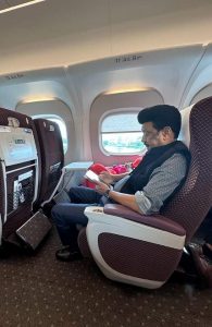 இதுகுறித்து தனது ட்விட்டர் பக்கத்தில், ‘ஒசாகா நகரிலிருந்து டோக்கியோவுக்கு புல்லட் ரயிலில் பயணம் செய்கிறேன். ஏறத்தாழ 500 கி.மீ தூரத்தை இரண்டரை மணிநேரத்திற்குள் அடைந்துவிடுவோம்.