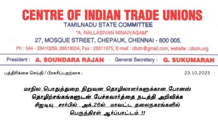 ’’மாநில பொதுத்துறை நிறுவன தொழிலாளர்களுக்கான போனஸ் குறித்து தொழிற்சங்கங்களுடன் பேச்சுவார்த்தை நடத்தி அறிவிக்க சிஐடியு சார்பில் அக்டோபர் 26 ஆம் தேதி, மாவட்ட தலைநகரங்களில் பெருந்திரள் ஆர்ப்பாட்டம் என்று அறிவிக்கப்பட்டுள்ளது.