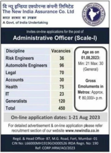 பதவிகள்: இடர் பொறியாளர்கள் (Risk Engineers), ஆட்டோமொபைல் பொறியாளர்கள் (Automobile Engineers), கணக்குகள்(Accounts), சட்டம் (Legal), சுகாதாரம் (Health), தகவல் தொழில்நுட்பம் (IT) மற்றும் பொதுவாதிகள் (Generalists) போன்ற பல்வேறு துறைகளில் 450 பல்வேறு காலியிடங்களுடன் வந்துள்ளது.
