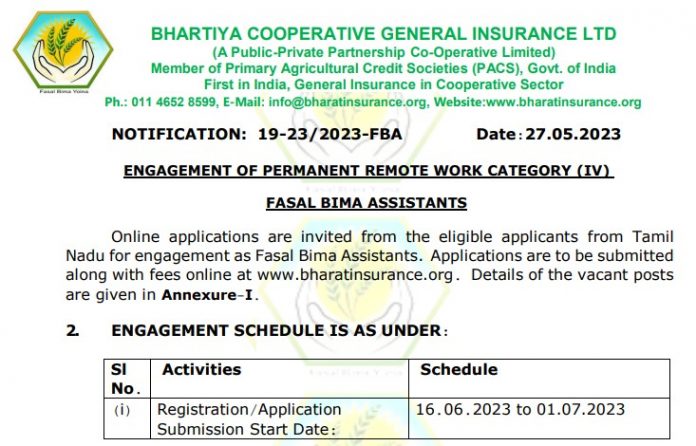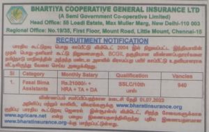 இத்திதிட்டத்தின் கீழ் 940 உதவியாளர், மாவட்டம் வாரியாக தமிழ்நாட்டில் தேர்வு செய்யப்பட உள்ளனர். கல்வித்தகுதி 10-ம் வகுப்பு பாஸ் ஆகி இருக்க வேண்டும். கூடுதல் கல்வி தகுதி ஏற்றுக் கொள்ளப்படும். தேர்வு கிடையாது. ரூ.250 விண்ணப்பக் கட்டணம். 18 வயது முதல் 40 வயது வரை விண்ணப்பிக்கலாம். மத்திய அரசு விதிகளின்படி வயதில் தளர்வு உண்டு. ஜூலை 1-ம் தேதி, விண்ணப்பிக்க கடைசி நாள் ஆகும். www.bharatinsurance.org என்ற இணையத்தில் ஆன்லைனில் விண்ணப்பிக்க வேண்டும் .