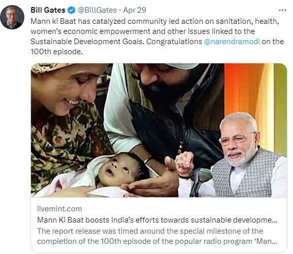 “என் நண்பர் பில் கேட்ஸின் பாராட்டு வார்த்தைகளுக்கு நன்றி. மனதின் குரல் நமது கிரகத்தை சிறப்பாக மாற்றுவதற்கான இந்திய மக்களின் கூட்டு மனப்பான்மையை பிரதிபலிக்கிறது, திரு. கேட்ஸும் இதில் ஆர்வமாக உள்ளார். நீடித்த வளர்ச்சி இலக்குகளின் வலுவான ஒத்திசைவு ஆய்வில் சிறப்பாக எடுத்துக்காட்டப்பட்டுள்ளது@ by @BMGFIndia.”