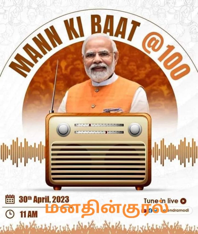 எனதருமை நாட்டுமக்களே, வணக்கம். இன்று மனதின் குரலுடைய 100-ஆவது பகுதி. உங்களுடைய ஆயிரக்கணக்கான கடிதங்கள் எனக்குக் கிடைத்திருக்கின்றன, இலட்சோபலட்சம் செய்திகள் வந்திருக்கின்றன, முடிந்த மட்டிலும் அதிகபட்ச கடிதங்களைப் படிக்க வேண்டும், பார்க்க வேண்டும், செய்திகளைப் புரிந்து கொள்ள முயல வேண்டும் என்று விரும்பியிருக்கிறேன். உங்களுடைய கடிதங்களைப் படிக்கும் வேளைகளில் பல சமயம் நான் உணர்ச்சிவயப்பட்டேன், உணர்வுகளில் அமிழ்ந்து போனேன், உணர்வுகளால் ஆட்கொள்ளப்பட்டேன், அடித்துச் செல்லப்பட்டேன், ஆனால் ஒருவழியாக, என்னையே நான் நிதானித்தும் கொண்டேன். நீங்கள் மனதின் குரலுடைய 100ஆவது பகுதிக்காக பாராட்டுக்களைத் தெரிவித்திருக்கிறீர்கள் ஆனால், உள்ளத்தில் உள்ளதை உள்ளபடியே உரைக்கிறேனே – பாராட்டுக்களுக்கு மொத்தச் சொந்தக்காரர்கள், மனதின் குரலின் நேயர்களான நீங்களும், நம்முடைய நாட்டு மக்களும் மட்டுமே. மனதின் குரல்….. கோடானுகோடி பாரதநாட்டவர்களுடைய மனங்களின் குரல், அவர்களுடைய உணர்வுகளின் வெளிப்பாடு.