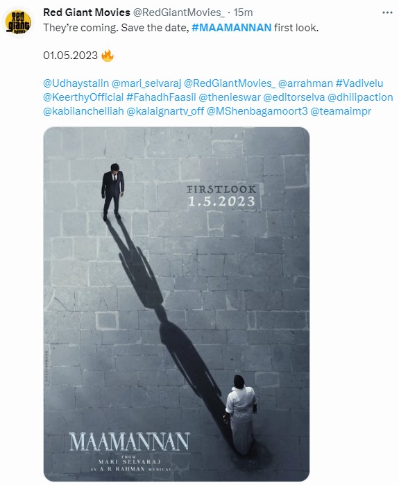 இந்நிலையில், ‘’இயக்குநர் மாரி செல்வராஜ் இயக்கத்தில் உதயநிதி நடிப்பில் உருவாகிய மாமன்னன் படத்தின் பர்ஸ்ட் லுக் 01.05.2023 அன்று வெளியாகும்’’ என்று அந்த படக்குழு அதிகாரப்பூர்வமாக இன்று 29.04.2023 மாலை 6 மணிக்கு அறித்தது. அந்த முதல் (MAAMANNAN first look) படத்தை அவரது ரசிகர்கள் ஆவலுடன் எதிர்பார்த்து இருக்கிறார்கள்.