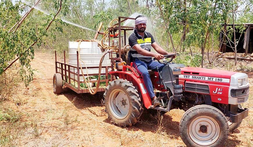 இந்த இயந்திரத்தை சிறிய டிராக்டரில் பொருத்தி பின்பகுதியில் பெரிய சின் டெக்ஸ் தொட்டியை இணைத்து அதில் போதுமான மருந்து மற்றும் தண்ணீர் கலந்து வைத்துள்ளார். டிராக்டரில் 3 அடி இடைவெளியில் உள்ள மரங்களை சுற்றி வரும்போது தானியங்கி இயந்திரத்தின் இரு பக்கங்களில் உள்ள குழாய்களின் வழியாக மருந்துகள் சுற்றி சுற்றி சொட்டுநீர் பாசனம் போல பீய்ச்சி அடித்து தெளிக்கிறது.