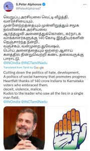 காங்கிரஸ் மூத்த தலைவரும் தமிழ்நாடு சிறுபான்மை ஆணையத்தின் தலைவருமான எஸ்.பீட்டர் அல்போன்ஸ் ‘ட்வீட்’ வருமாறு: