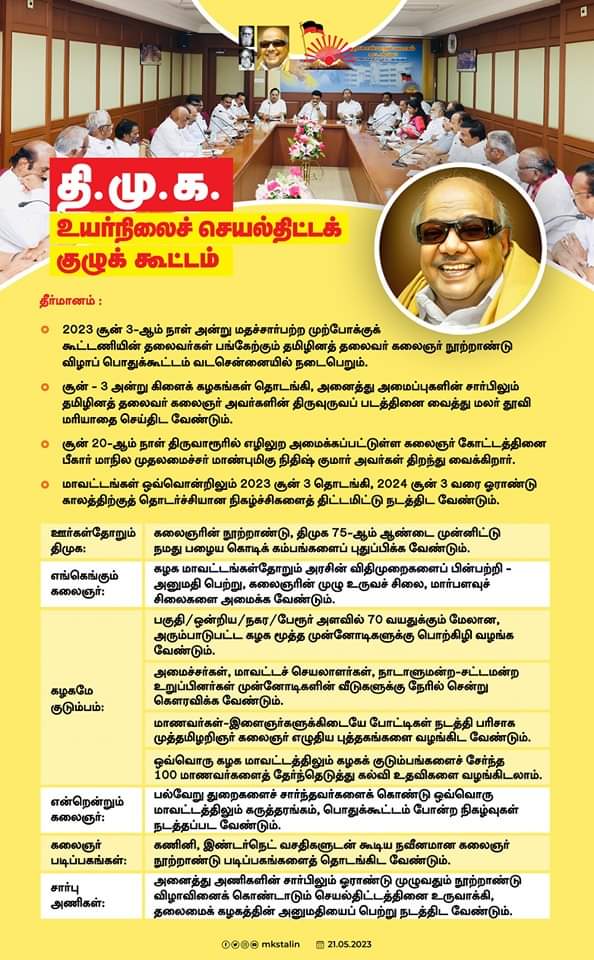 திமுக தலைவரும் முதலமைச்சருமான மு.க.ஸ்டாலின், “தமிழினத்தின் மேன்மைக்காகவும் தமிழ்நாட்டின் வளர்ச்சிக்காகவும் தன் வாழ்நாளெல்லாம் உழைத்த நம் உயிர்நிகர் தலைவர் கலைஞர் அவர்களின் நூற்றாண்டு விழாவினை ஆண்டு முழுவதும் கொண்டாடி அவரது சாதனைச் சரித்திரத்தை இல்லம்தோறும் எடுத்துச் செல்வோம்!