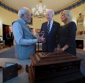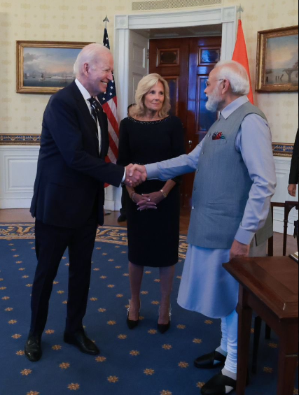 பிரதமர் நரேந்திர மோடி, அமெரிக்காவின் வெள்ளை மாளிகையில் 2023 ஜூன் 21-ந் தேதி அந்நாட்டு அதிபர் ஜோ பைடன் மற்றும் அந்நாட்டு முதல் பெண்மணியான டாக்டர். ஜில் பைடனை சந்தித்தார்.