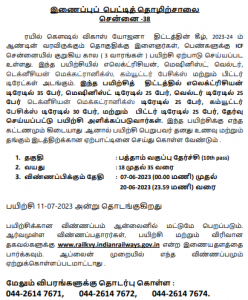 ]]>பெரம்பூர் இணைப்பு பெட்டித் தொழிற்சாலையில் இயந்திரவியல், மின்னியல், மருத்துவ பரிசோதனை தொழில் நுப்பவியலாளர்கள், மற்றும் புரோக்கிராமிங் மற்றும் சிஸ்டம் அட்மினிஸ்ட்ரேஷன் உதவியாளர் ஆகிய தொழில்களில் உள்ள 2023-2024 ஆம் ஆண்டுக்கான 782 காலியிடங்களில் (252 புதியவர்கள், 530 ஐடிஐ முடித்தவர்கள்) சேர்த்து தொழில்பழகுநர் பயிற்சி பெறுவதற்காக அன்லைன் விண்ணப்பங்கள் வரவேற்கப்படுகின்றன.