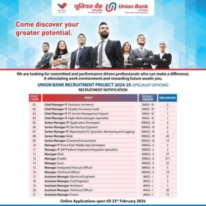 Union Bank of India வங்கியில் Specialist Officer பதவிகளுக்கு ஒதுக்கப்பட்டுள்ள காலியிடங்களை நிரப்பும் அறிவிப்பு தற்போது வெளியிடப்பட்டுள்ளது. இந்த அறிவிப்பில் Chief Manager, Senior Manager, Manager, Assistant Manager ஆகிய பணியிடங்கள் காலியாக இருப்பதாக கூறப்பட்டுள்ளது. இப்பணிகளுக்கான விண்ணப்பத்தை பிப்ரவரி 3 ஆம் தேதியில் இருந்து 23 ஆம் தேதி வரை ஆன்லைன் மூலம் விண்ணப்பிக்கலாம்.